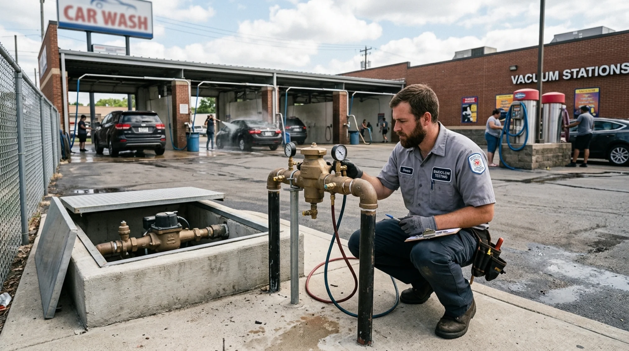 A certified backflow tester inspecting a reduced pressure backflow assembly beside the water meter at a busy commercial car wash, wash bays and vacuum stations visible in the background, natural daylight, no logos or text