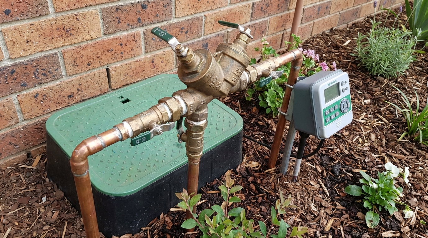 - Find your backflow preventer. It's usually near where the irrigation line branches off from the main water supply — often on the side of the house near the garage or near a valve box in the yard.